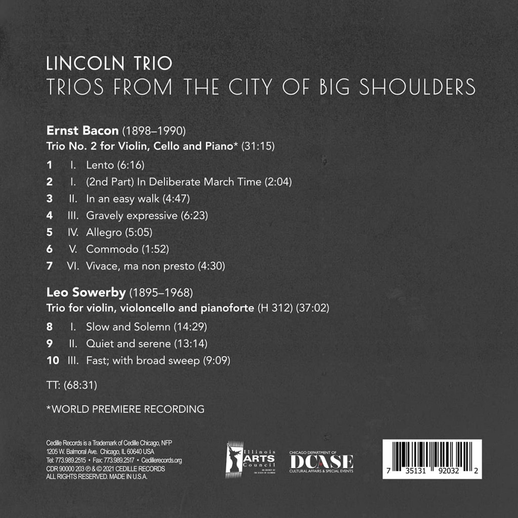 The Chicago based Lincoln Trio turns their creative radar to chamber music by two now virtually unknown Chicago composers, Ernst Bacon (1898-1990) and Leo Sowerby (1895-1968). (Sowerby’s music has enjoyed no fewer than 7 CD releases on this label.) Both of these composers were rather prolific and well known during their lifetimes but, for whatever reason, they are no longer household names. These are composers who wrote in a largely post-romantic idiom which one might translate as “audience friendly” and one might suggest that their home grown romanticism was eclipsed by modernism but these guys aren’t only audience friendly, these works have the weight of substance. This is not ear candy, this is serious music that reveals more depth and significance with each hearing.