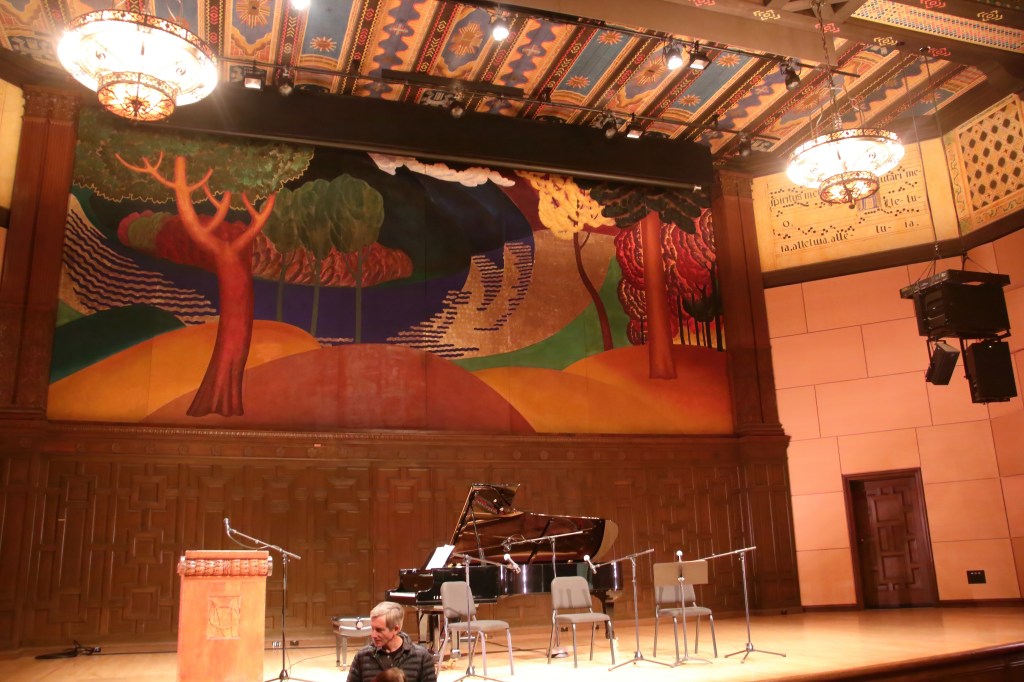 This evening was one of the lecture recital variety. Kyle Gann, composer, writer, critic, musicologist, OM alum, and vice president of the Charles Ives Society was brought in to provide the lecture portion of the evening. In addition, this event was held at a major temple of new music in the Bay Area, Mills College (actually Amirkhanian’s alma mater). The beautiful Littlefield Concert Hall itself displays the striking work of California architect, Julia Morgan. Artistic spirits past and present were undoubtedly here this night in the history of this place as well as those artistic spirits present in the audience.