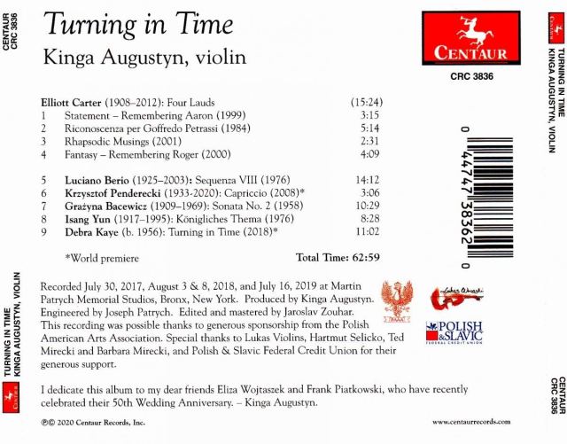 How often can one expect to find a solo violin disc where the only familiar piece is one of Luciano Berio’s Sequenzas? Well this is that disc. The earliest work here is Grazyna Bacewicz’s (1909-1969) Sonata No. 2 (1958). Berio’s Sequenza VIII (1976). Along with Isang Yun’s (1917-1995) Koenigliches Thema (1976) are also 20th century pieces. And though the four movements of Elliot Carter’s (1908-2012) Four Lauds begin in the late 20th century (Riconoscenza per Goffredo Petrassi, 1984 and Remembering Aaron, 1999) they end in the 21st century with Remembering Roger, 2000 and Rhapsodic Musings, 2001.