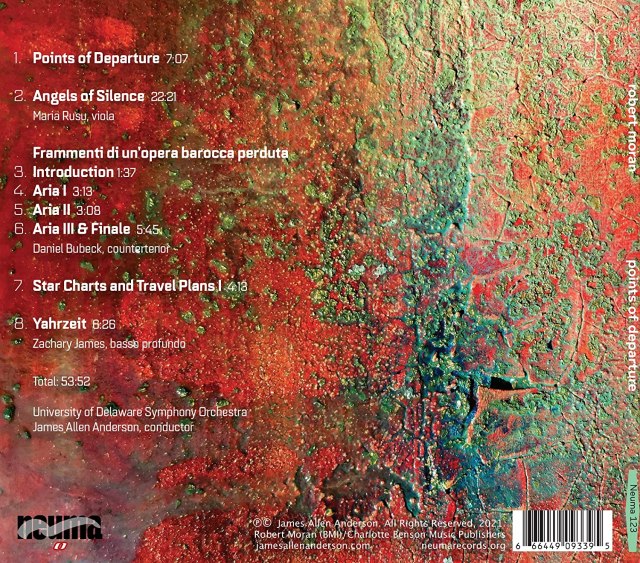 The present disc consists of five works, only one of which (Points of Departure) has been recorded before. Composition dates range from 1973 to 2017. Moran’s work is widely eclectic reflecting his early study with Second Viennese composer Eric Apostel, his M.A. studies at (the now lamentably defunct) Mills College where he studied with Luciano Berio and Darius Milhaud. HIs work ranges from graphic scores to post minimalist and post modern/neo-romantic styles doubtless influence at least in part by the various places he has lived (Vienna, Milan, Berlin, Portland, San Francisco, and Philadelphia where he now makes his home).