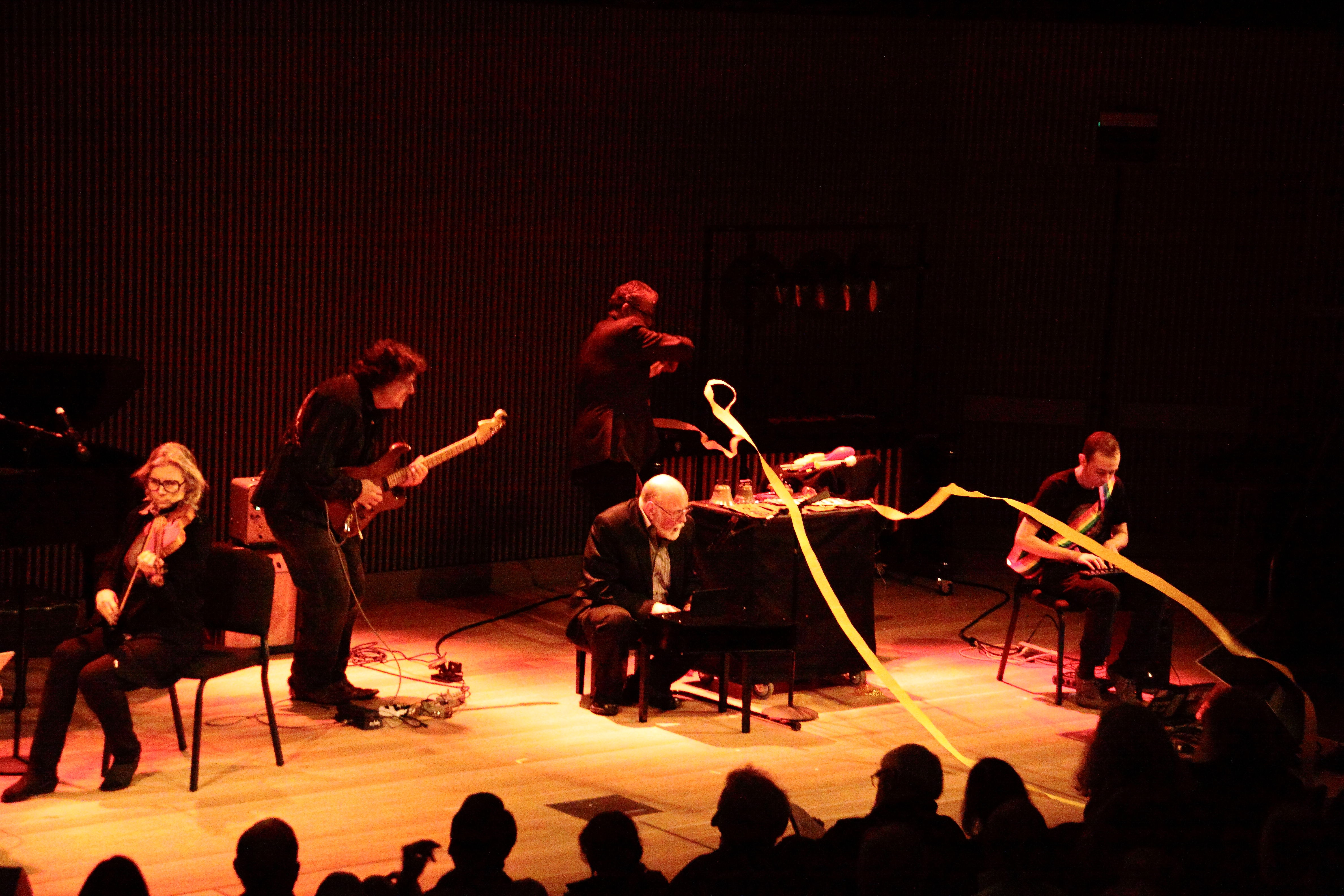 Don Buchla on the Buchla Bos and Nannick Buchla on the piano with film projection performing Drop by Drop (2012) in its American premiere.